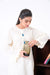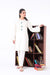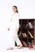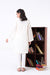 A minimalist design is layered over this trendy jacquard ensemble rendered in a classic ivory shade. Crafted in an experimental silhouette, the contrast teal tassels on the placket add a hint of color to this look. The placket is further enhanced with matching white beads.